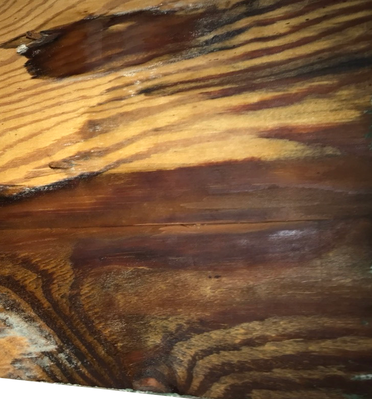 When you perform a roof inspection, the first step is to look for stains on the plywood in the attic. Even a minor leak will create a significant stained area that is easy to see, as shown in the photo below