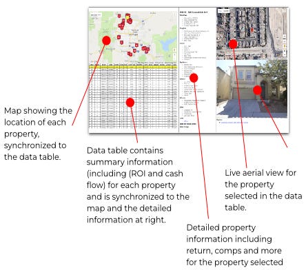 Here is a video walk-through of the Investor Tool. Here is a sample Investor Tool. We send a link to a new set of properties to active clients every 3 or 4 days.
