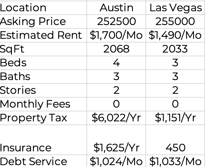 Return calculations also work well for comparing properties in different locations. It is important that you include all significant recurring costs. For example, below are two properties. One is in Austin and the other is in Las Vegas. Based on the information below, which one is the better investment?