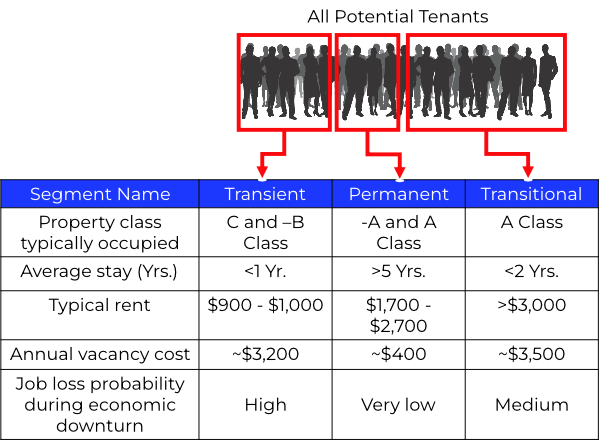 Return calculations only provide the apparent return. They do not take into account factors such as vacancy costs. The show the impact of vacancy costs, I will use information about the three major tenant pool segments in Las Vegas.