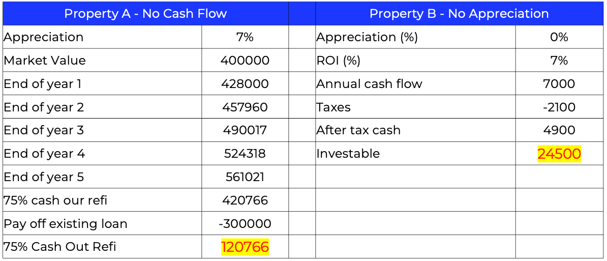 Below is a table comparing the 5-year result between cash flow and appreciation.
