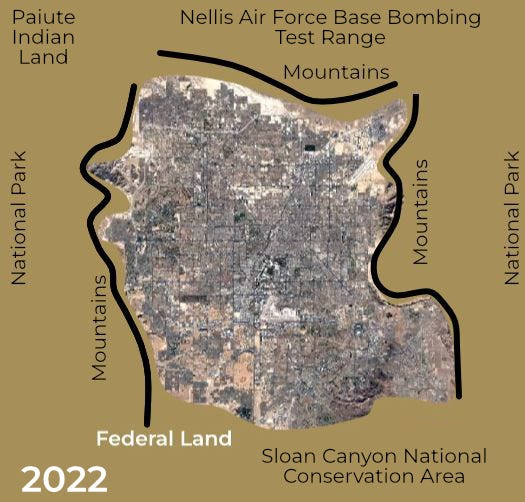 Las Vegas is unique. Unlike sprawling cities like Phoenix or Houston, Las Vegas is constrained by federal land ownership — 88% of Clark County is federally controlled and, due to land usage around the Las Vegas metro area, there is no practical way to expand. See the map below.